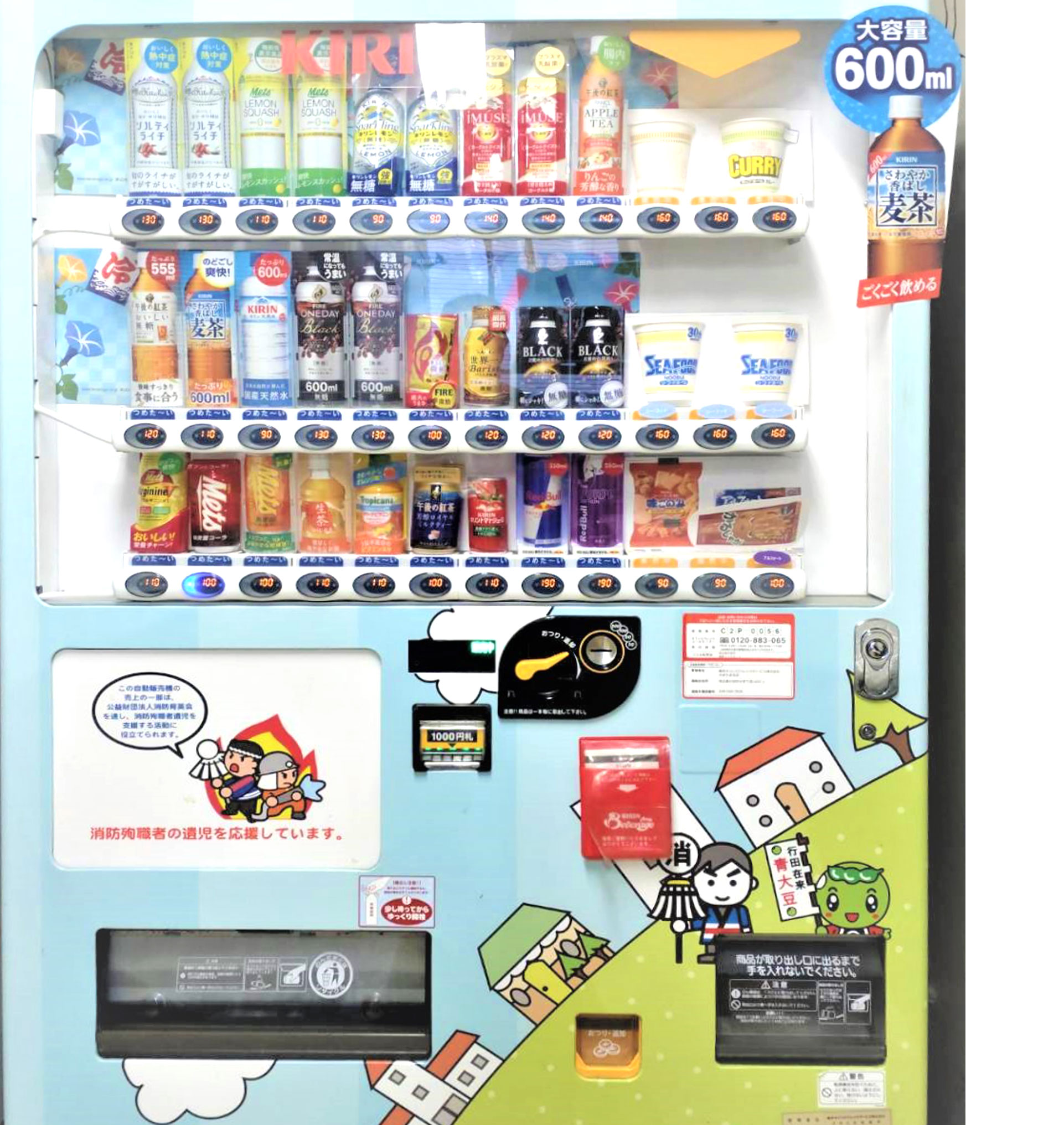 消防育英会の奨学金等の資金を少しでも確保するための飲料水等販売業者との共同事業で、消太くんのロゴの入った自動販売機を設置していただくと、その売り上げの一部(一本につき2円)が飲料水等販売業者から消防育英会に寄付されるものです。